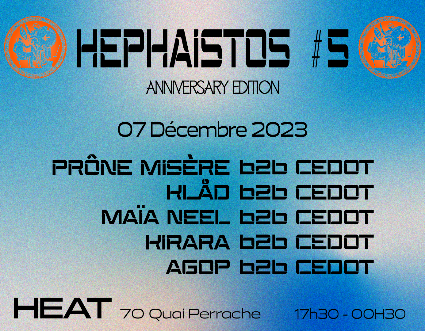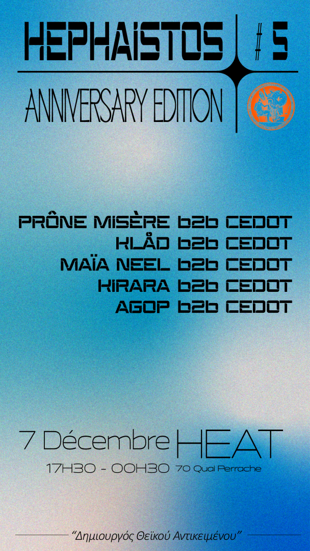Hephaïstos fait son retour au Labo de HEAT pour une 5ème Édition Anniversaire de cette soirée ! Au programme, 5 artistes ayant déjà joué sur une précédente édition de la soirée reviennent en B2B avec le résident d’Héphaïstos, Cedot, présent en All Night Long pour 8h de fêtes.