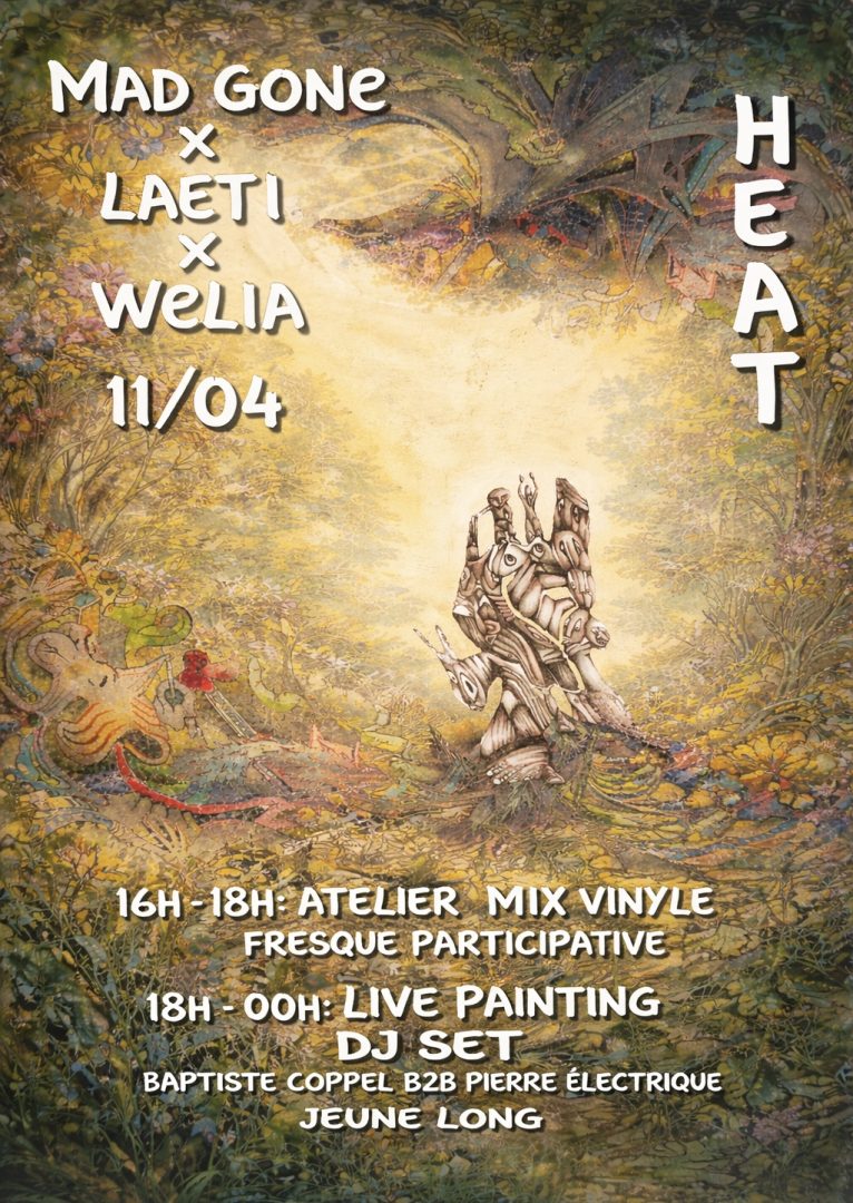 On vous convie pour huit tours de cadran, tantôt pour vous faire la main sur ces foutus tournes-disques, tantôt pour admirer le live painting de Laeti et Welia. De notre côté, notre ami de longue date, jeune et long, orchestrera tout ce petit manège en musique… À tout vite »