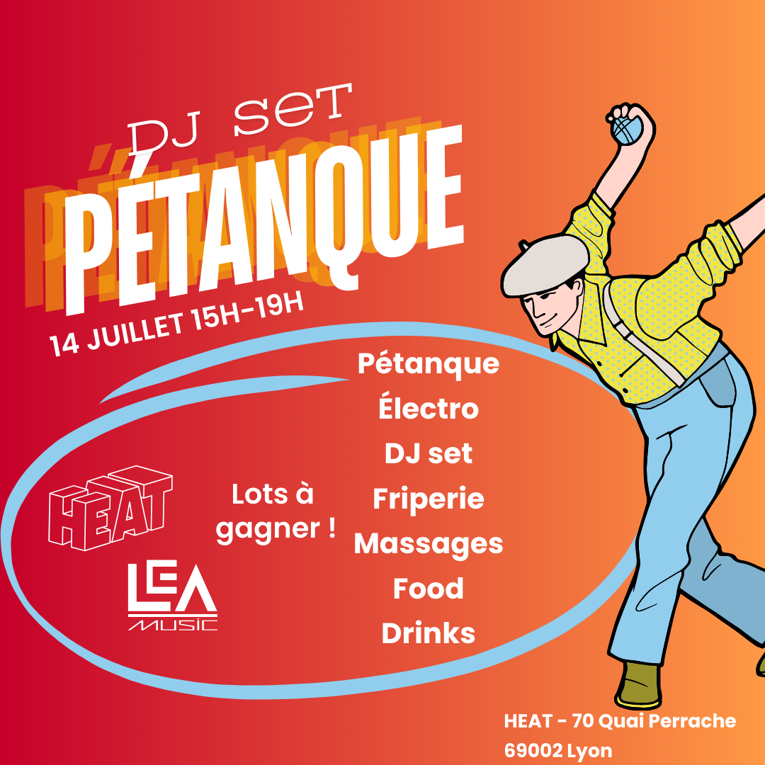 En ce dimanche de fête nationale, rendez-vous à HEAT pour un dimanche enflammé : Tournoi de pétanque, friperie, massage à prix libre, et open air au programme !