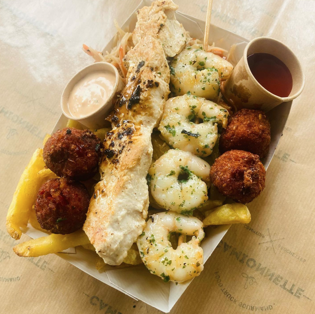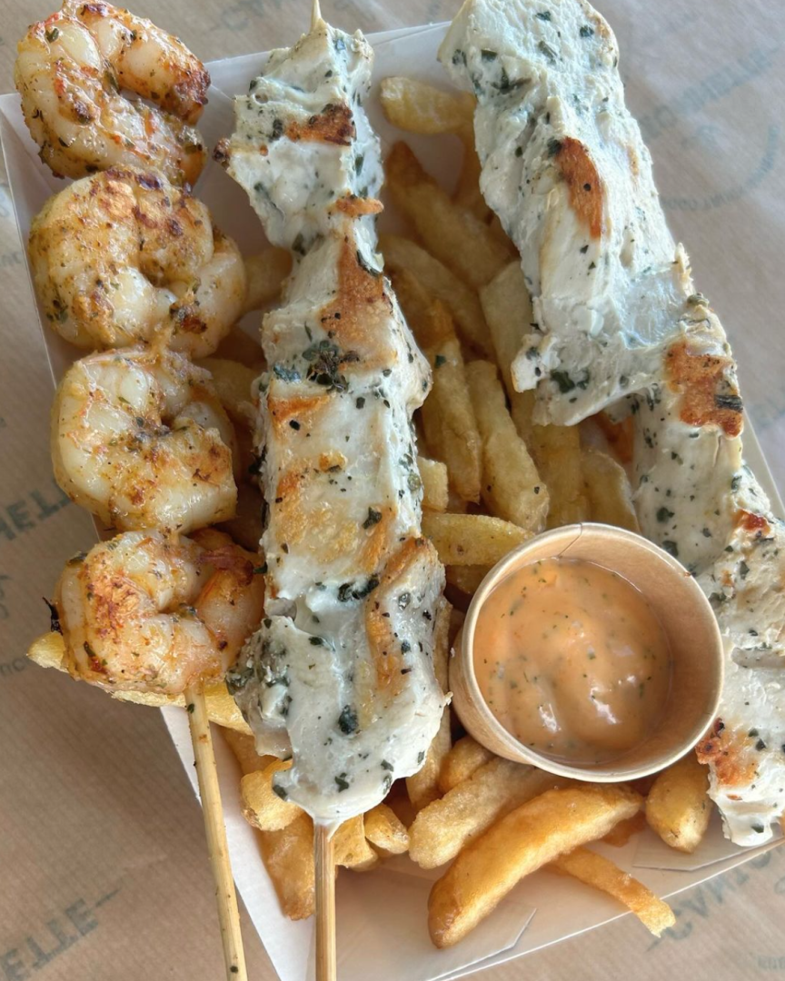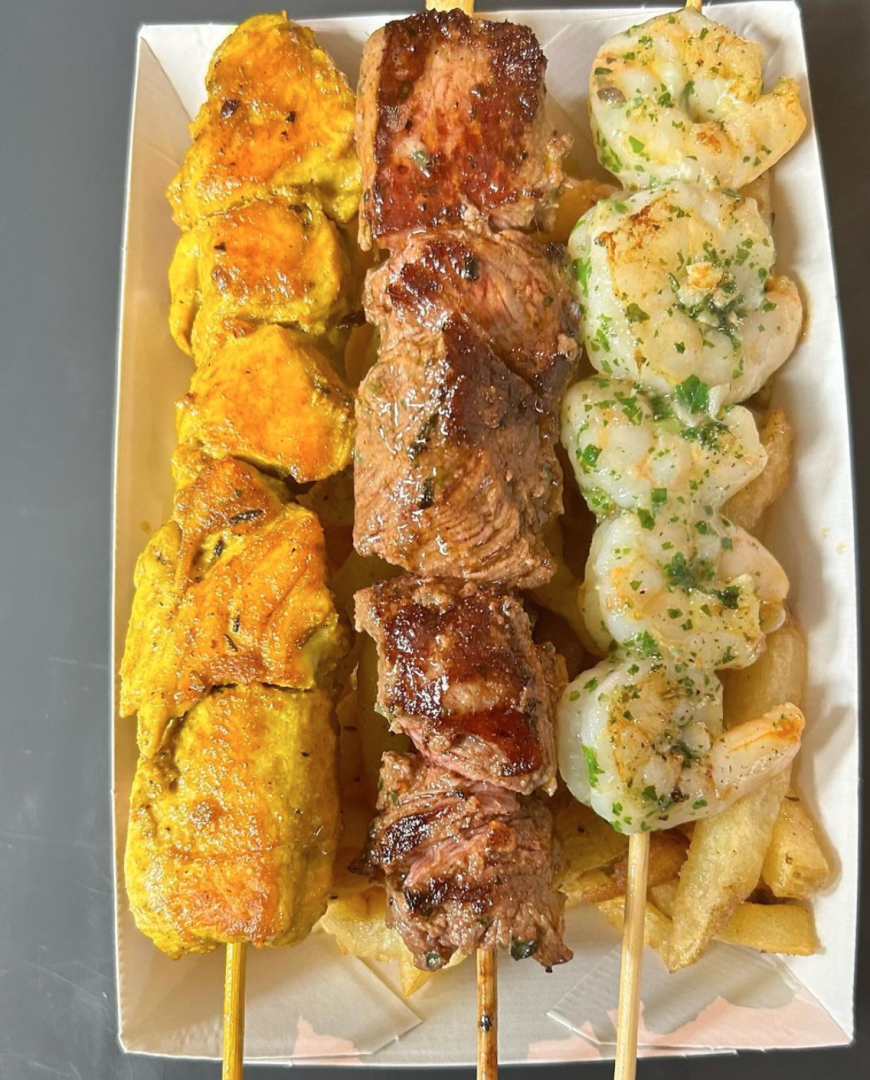 brochettes marinées, des légumes de saison, des frites et des desserts maison